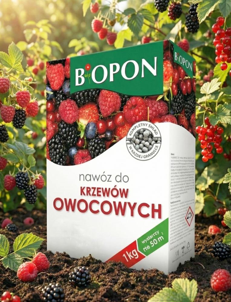Biopon Nawóz do krzewów owocowych w formie granulatu to kompleksowy preparat stworzony specjalnie dla drzew i krzewów owocowych. Jego skład obejmuje azot (8%), fosfor (9%), potas (9,5%), wapń (5%), magnez (2%), siarkę (21%) i żelazo (1%), co zapewnia kompletny zestaw składników odżywczych niezbędnych do zdrowego wzrostu i obfitego plonowania.