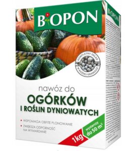Nawóz do ogórków i roślin dyniowatych BIOPON – wieloskładnikowy nawóz mineralny do ogórków i roślin dyniowatych, takich jak cukinie, dynie, patisony i melony. Doskonale zaspokaja ich wysokie wymagania pokarmowe, zapewniając tym samym zdrowe i obfite plonowanie. Ponadto odpowiednio dobrane składniki nawozu zwiększają odporność tych roślin na wymarzanie oraz wpływają pozytywnie na wielkość warzyw i ich walory smakowe.